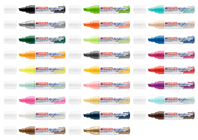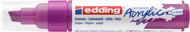* Acrylmarker om te verven op lichte of donkere oppervlakken, ideaal voor materialen zoals linnen of verfpapier. * De beitelpunt heeft een schrijfbreedte van 5-10 mm. * De hoogwaardige gepigmenteerde acrylverf op waterbasis dekt goed, is lichtecht, geurloos en permanent wanneer de verf droog is. * Verkrijgbaar in 26 verschillende kleuren, in verschillende schrijfbreedtes. * Er zijn geschikte reservepunten (edding 5000 reservepunten) verkrijgbaar.