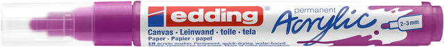 * Acrylmarker om te verven op lichte of donkere oppervlakken, ideaal voor materialen zoals linnen of verfpapier. * De ronde punt heeft een schrijfdikte van 2-3 mm.* De hoogwaardige gepigmenteerde acrylverf op waterbasis dekt goed, is lichtecht, geurloos en permanent wanneer de verf droog is. Verkrijgbaar in 26 verschillende kleuren. * Er zijn verschillende schrijfbreedtes beschikbaar. * Geschikte reservepunten (edding 5100 reservepunten) verkrijgbaar.