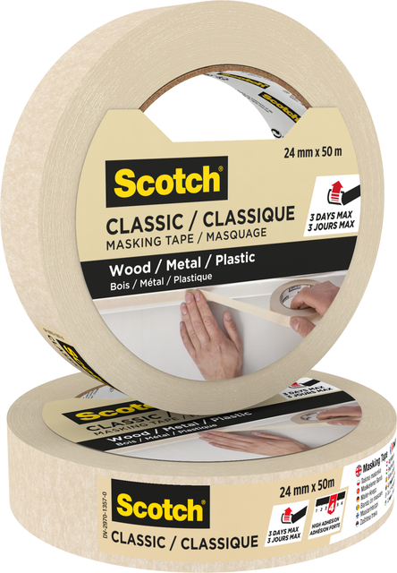 * Gebruik Scotch® Classic afplaktape als u een klassieke tape wenst, die tot 3 dagen aan ondergronden blijft hechten en daarna gemakkelijk zonder lijmresten verwijderbaar is. Deze klassieke beige afplaktape scheurt u gemakkelijk met de hand af. Ideaal voor binnengebruik met een middelsterke tot sterke hechting aan hout, metaal en plastic. * Klassieke afplaktape voor algemeen afplak- en afdekwerk. * zonder lijmresten verwijderbaar tot 3 dagen na het aanbrengen.