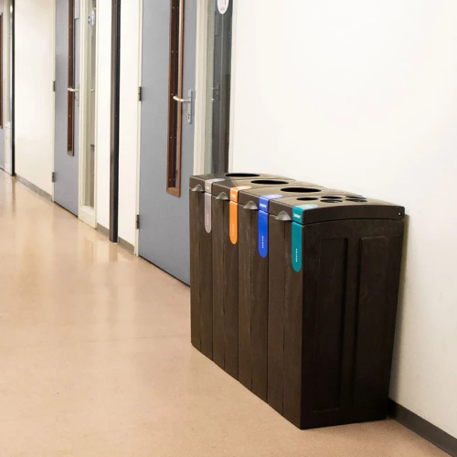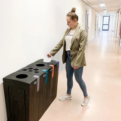 Circulaire afvalscheidingsmodule van 100% gerecycled polypropyleen uit bouw- en sloopafval en grofvuil. Doordat er bij de productie gebruik is gemaakt van gerecyclede kunststoffen heeft iedere unit een uniek uiterlijk. Modulair systeem, klik eenvoudig verschillende modules aan elkaar tot een complete afvalscheidingsunit. De module heeft een kunststof binnenemmer en is voorzien van een gekleurde sticker om de afvalstroom aan te duiden (Nederlandse tekst). De Bonton Original is tevens zonder bestickering leverbaar. Afwijkende stickers op aanvraag. Perfect passende afvalzakken om de Bonton schoon te houden zijn apart te bestellen. Formaat (mm) B 280 D 430 H 771