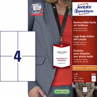 * Het groter formaat badge is ideaal voor evenementen of seminars waar de badge meer informatie moet bevatten zoals een plattegrond omschrijving. * Complete set met naambadgehouders, bedrukbare insteekkaarten en lanyards. * A6-formaat is ideaal geschikt wanneer u meer informatie kwijt wil op uw naambadge. * Badgehouders gemaakt van PVC vrij materiaal. * Bedrukbare insteekkaarten zijn gemaakt van FSC-gecertificeerd papier. * Bespaar tijd met GRATIS gemakkelijk te gebruiken Avery templates en software. * 10 badges en 12 insteekkaarten. 1 doos x 10 stuk