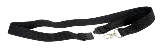 * Badgekoord van textiel voor badge- of pashouders. * Voorzien van een metalen karabijnhaak en kunststof veiligheidssluiting. * Ook geschikt als sleutelhanger. * Lengte 44cm. Breedte 20mm. * Kleur zwart. * Verpakt per 10 stuks. 10 stuk
