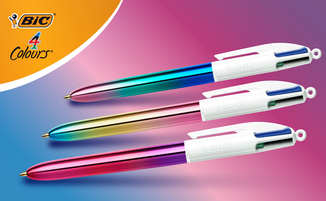 * Een nieuwe interpretatie van een tijdloze klassieker! * Het tijdloze design van de BIC 4 Colours pen is makkelijk te herkennen: tweekleurige huls, clip om aan schriften of zakken vast te hangen, kenmerkend open bolletje op de bovenkant. * De BIC 4 Colours pen gaat altijd met zijn tijd mee. * De nieuwe pen met subtiel metallic effect heeft een driekleurige body en is verkrijgbaar met kleurverloop in 3 verschillende kleuren (willekeurig gekozen). * Verzamel ze allemaal! * De klassieke 4 Colours pen schrijft in het blauw, rood, groen en zwart. * Deze verpakking bevat 3 BIC 4 Colours balpennen met subtiel metallic effect in een koker van 30 stuks, geproduceerd in de Franse BIC-fabrieken met een traditionele knowhow. * Een BIC, een echte. 30 stuks