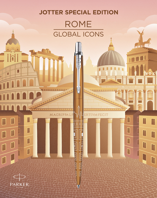 Voor een pen die wereldwijd geliefd is, is het passend dat de nieuwste Jotter SE-collectie haar inspiratie haalt uit alle werelddelen. De vierde ‘Global Icons’ Speciale Editie verkent enkele van de indrukwekkende 3000 jaar oude architectuur en decors van Rome. Een prachtig ontwerp maakt gebruik van een opvallend patroon van de unieke koepel van het Pantheon en de majestueuze skyline van deze stad van oude wonderen. Dit is op een prachtige manier in de huls van dit verfijnde schrijfinstrument gelaserd met behulp van het onmiskenbare vakmanschap van PARKER. Een satijn bronzen gelakte afwerking zorgt voor een comfortabele schrijfervaring en een sterke achtergrond om de historische magie van Rome te tonen. Voor alle reislustigen, laat de Jotter SE Rome balpen je wereldwijde gids zijn.