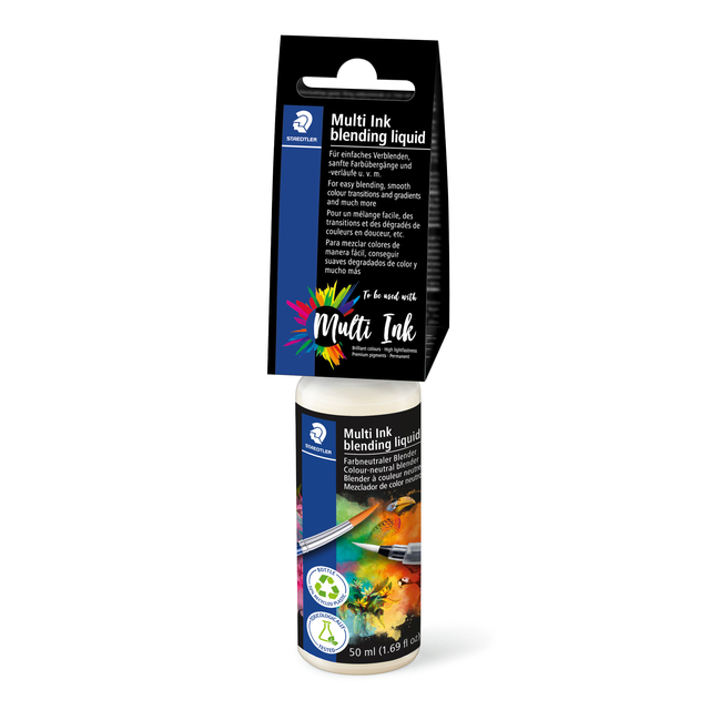 * Staedtler Multi Ink blending liquid. Deze blender lost de permanente Multi Ink op: Hiermee kunnen kleuren worden gemengd, gladde kleurovergangen en gradients worden gecreëerd, evenals aquarel- en ombré-effecten. Kleuren kunnen worden opgefrist: kan worden gebruikt om lichtreflecties te creëren en zelfs om kleine foutjes te corrigeren. Blender op waterbasis met een lage geur. Optimale resultaten kunnen worden bereikt op aquarelpapier en op niet-absorberende oppervlakken. Breng eenvoudigweg de mengvloeistof aan met een kwast of vul de tank van een waterkwast. * Plastic fles met praktische doseertip. * Inhoud: 50ml.