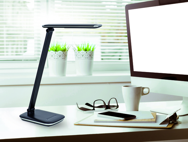 * Dimbare LED bureaulamp tegen een betaalbare prijs met geintegreerde 5V, 500 mA USB-stekker voor het opladen van tablet's of smartphones. * Arm van geanodiseerd aluminium * Ruimtebesparend en handzaam * Technisch veiligheidsconcept Made by MAUL * Dimmer via touchpad met 5 standen aan lampenvoet * Diffusor zorgt voor minder schaduwwerking * Kleur 02: Verlichting in touchpad toont de dimstand * Vervanging van lichtbron en voorschakelapparatuur mogelijk * Lichtsterkte lamp:2060 lux op 35 cm afstand * Kleurtemperatur (per lichtbron)4.000 Kelvin (neutraal wit) * Aantal lichtbronnen:1 * Energie-efficiëntieklasse (per lichtbron) E (spectrum A tot G) * Gewogen energieverbruik (per lichtbron)6 kWh/1000 h * Levensduur L70B50 (per lichtbron)20.000 h * Nuttige lichtstroom (per lichtbron)716 Lumen * Voet:standvoet * Materiaal:Kop: kunststof - Arm: aluminium geanodiseerd - Voet: kunststof - Voet: verzwaringsinzetstuk, werkblad beschermende onderlaag * Afmetingen:Hoogte: 42,5 cm - Kop: 26,5 x 5 cm - Arm: lengte 36,5 cm - Voet: 18 x 13 cm * Mobiliteit:Kop: kantelbaar, draaibaar - Arm: kantelbaar * Schakelaarpositie:Voet