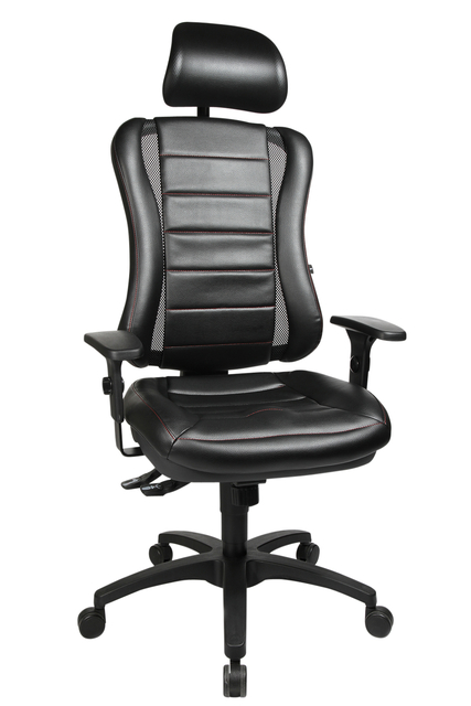 * Sportieve bureaustoel met een ergonomisch, contourvormig in hoogte verstelbare rugleuning. * Hoogwaardig kunstlederen bekleding, afgewerkt met een rood stiksel. * Comfortabele XXL voorgevormde zitting en handige steun voor knieën. * Punt synchroonmechaniek voor synchrone verstelling van de zitting en rugleuning, individueel inregelbaar op basis van het lichaamsgewicht. * Zithoogte verstelbaar door Toplift. * Multifunctionele hoofdsteun, in hoogte en hoek verstelbaar. * In hoogte verstelbare armleuning met softpads. * Modern en solide onderstel voorzien van geremde wielen, geschikt voor een zachte ondervloer. * Ideaal voor het thuiswerken.* Dit artikel dient nog gemonteerd te worden.