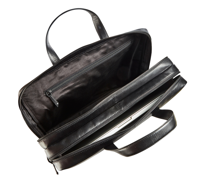 * MAVERICK ALL BLACK lederen business tas met laptopvak 15,6". * Stijlvolle, lederen laptoptas met ritssluiting en handige extra opbergvakken. * Deze Maverick laptoptas heeft 2 hoofdcompartimenten met een verstevigd 15’6 inch laptopvak. * Buitenvak voor documenten, zodat je deze snel binnen handbereik hebt. * Maverick ALL BLACK, dat is plantaardig gelooid volnerf rundsleder. * Nachtzwart, met een natuurlijke glans. * Ambitieus met stijl. *Volnerf rundsleder. * Plantaardig gelooid leder. * 15’6 inch laptopvak (max. afmeting 37 x 25 cm). * 2 hoofdvakken met ritssluiting. * Internal organizer. * Handig easy access voorvak met rits. * Riem om aan trolley te bevestigen. * Afneembare schouderband.