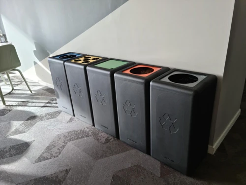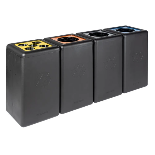 Duurzame afvalbak van uw gerecyclede plastic om afval gescheiden in te zamelen. Nederlandse productie gemaakt van gerecycled plastic (HDPE) bestaande uit doppen en verpakkingen die middels een rotatiegietproces vervaardigd wordt. 100% circulair. De afvalscheidingsunit heeft een scharnierend deksel met gekleurde aluminium plaat met opening (Ø 20 cm). Recycling stickers om de verschillende afvalstromen duidelijk te maken worden meegeleverd. De geïntegreerde zakhoudbeugels zorgen ervoor dat de afvalzak eenvoudig te klemmen is. Optioneel is er een kunststof schroevenset beschikbaar om meerdere bakken te koppelen tot afvalscheidingsstation. De Nederlandse fabrikant is gespecialiseerd in design producten van recyclebare materialen waardoor het zelfs mogelijk is om van ‘eigen’ afvalstromen customized afvalbakken te laten produceren. Vraag naar de mogelijkheden. Formaat (mm) B 350 D 350 H 700