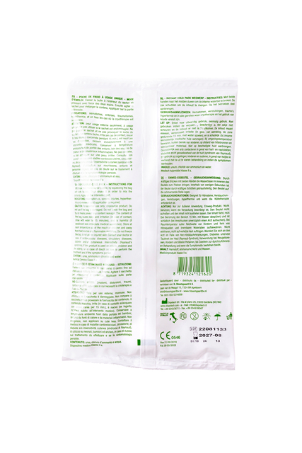* Dit koude kompres werkt verkoelend en is voor eenmalig gebruik. * Wanneer het kompres wordt ingeknepen worden de koolzuurkorrels vermengd met water en koelt het kompres af tot ongeveer 5 graden Celsius gedurende 10 tot 15 minuten.