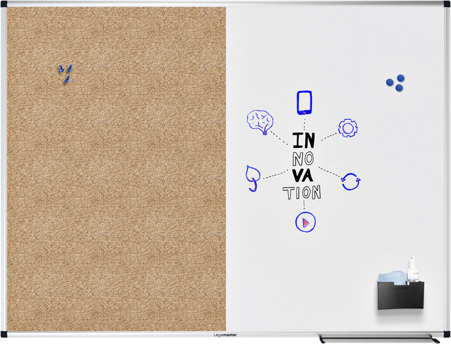 * Functioneel whiteboard plus prikbord voor regelmatig gebruik in het kantoor of thuiskantoor. * De ene helft: een magnetisch bordoppervlak van gelakt staal, Geschikt om met droog uitwisbare whiteboard markers te beschrijven. * De andere helft: een prikbord met een oppervlak van natuurlijke kurk. * Aluminium frame met grijze kunststof hoekdoppen (Pantone 433C). * Kan horizontaal of verticaal worden bevestigd. * Afleggoot van (30cm) met eindkapjes, montageset en montagehandleiding meegeleverd. * Legamaster biedt een breed scala aan accessoires: Wij adviseren de 27-delige STARTER Whiteboard Accessoireset en droog uitwisbare board markers. * Ruimtebesparend bord met een tweeledige functie: om te schrijven of te gebruiken als prikbord. * Goed schrijfoppervlak en eenvoudig droog uitwisbaar. * Eenvoudig aantekeningen, schetsen en foto's bevestigen met gebruik van magneten of push pins. * Eenvoudige en verborgen muurbevestiging. * 5 jaar garantie op de perfecte beschrijfbaarheid en wisbaarheid van het bordoppervlak indien gebruikt in combinatie met accessoires van Legamaster.