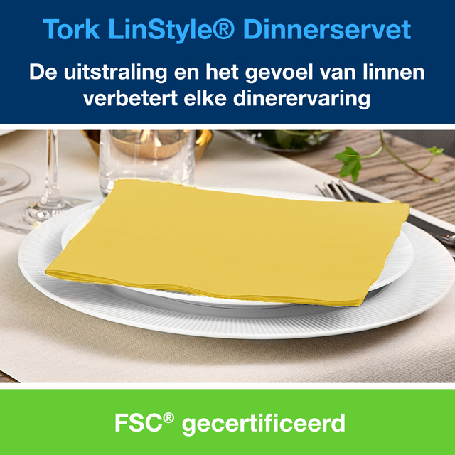 * Tork LinStyle® Dinerservet in de kleur mosterdgeel laat je als restaurant zien dat er oog is voor detail. * Papieren servetten van LinStyle® voelen aan als kwaliteits linnen, maar zijn voor eenmalig gebruik. * Deze servetten zijn bijzonder sterk en absortberend zodat ze een heel diner mee gaan. * Dankzij de grootte en dikte zijn ze gemakkelijk te vouwen voor een elegante tafel. * Bespaar waskosten door te kiezen voor deze elegante servetten. * Afmeting 90 x 195 x 195mm.
