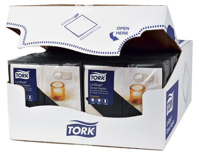 * Tork LinStyle® Dinerservet in zwart laat je als restaurant zien dat er oog is voor detail. * Papieren servetten hebben niet altijd de luxe uitstraling van textiel, maar de servetten LinStyle® voelen aan als linnen en gaan een hele maaltijd mee. * Deze eenmalige servetten worden voorgevouwen geleverd en hoeven niet gewassen te worden. * Luxe servetten voor efficiënter en duurzamer gebruik. * Afmeting 90 x 195 x 195mm.