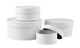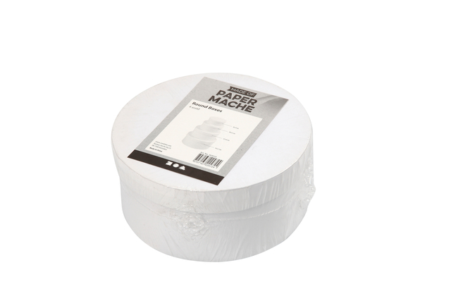 * Set met 4 ronde dozen met deksels van wit karton. * Formaat van de dozen: de kleinste doos begint bij een diameter van 8cm en hoogte 4cm, de tweede doos heeft een diameter van 10cm en hoogte 5cm, de derde doos een diameter van 12cm en hoogte 6cm en de grootste doos diameter 14cm en hoogte 7cm.