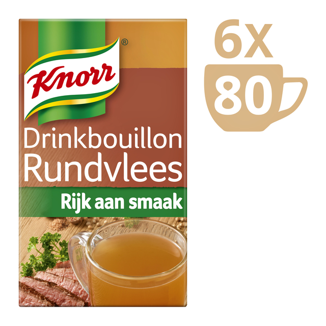 * Knorr Drinkbouillon rundvlees is een heerlijke krachtige bouillon, voorzien van een verfijnde smaak door de toevoeging van vele kruiden. * Het is een lekker hartig tussendoortje en bevat bovendien slechts weinig calorieën per kop. * Een verpakking bevat 80 sachets waarmee je snel een hartige snack kan maken. * 1 sachet is goed voor één kop drinkbouillon. * Knorr Drinkbouillon Rundvlees bevat geen conserveermiddelen en kunstmatige kleurstoffen.