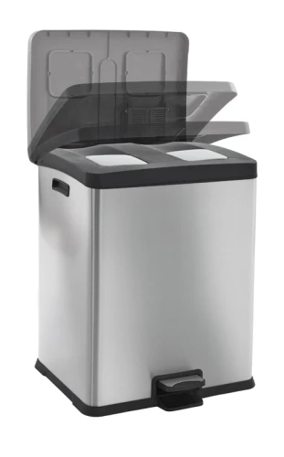Ruime rechthoekige pedaalemmer van mat RVS met 2 kunststof binnenemmers (2x 30 ltr). Voorzien van gedempt kunststof deksel en Fingerprint Proof coating. Formaat (mm): B 459 D 495 H 636. Kleur: mat RVS