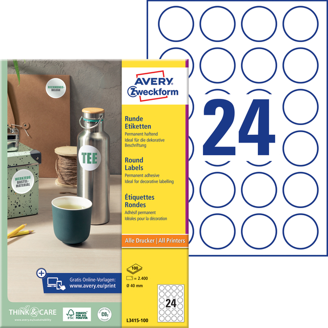 * Voor een bijzondere uitstraling! * Deze witte, kleine ronde etiketten van Avery kunt u voor verschillende toepassingen gebruiken. * Perfect in te zetten als productetiketten op jam- of cosmeticapotten, deksels, glaasjes of verpakkingen. * Voorzie ze van uw eigen logo en productinhoud en klaar is uw professionele etiket. * Ook ideaal om in te zetten voor promotiedoeleinden en natuurlijk voor alle andere markeringen die op moeten vallen. * De zelfklevende etiketten met een diameter van 40 mm zijn eenvoudig te bedrukken met behulp van de Avery online software en templates. * Ze zijn praktisch in gebruik op zowel het werk of thuis. * Tevens ideaal voor het etiketteren van kantoorbenodigdheden, mappen, documenten of opbergdozen. * U bent verzekerd van een betrouwbare kleefkracht waardoor deze etiketten uitstekend plakken op uiteenlopende ondergronden zoals glas, karton, papier of plastic. * Milieuvriendelijk: Het materiaal van deze chloorvrij gebleekte etiketten is gemaakt van 100% FSC®-gecertificeerd papier uit duurzaam beheerde bossen. * U kunt vertrouwen op een gegarandeerd storingsvrije printerdoorvoer zonder lijmvloeiing in uw printer. * Deze etiketten kunnen op alle gangbare laser- en inkjetprinters worden bedrukt. * Met Avery Design & Print Online kunt u de etiketten snel een eenvoudig vormgeven en printen. * Gewoon het artikelnummer invoeren, ontwerpen, printen en klaar!
