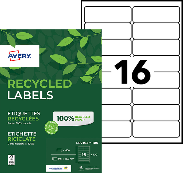* Deze etiketten zijn vervaardigd van 100% gerecycled papier, zowel front- als rugmateriaal. * Etiketten zijn voorzien van Blauwe Engel certificaat. * Gerecyclede Laser adresetiketten zijn voorzien van de unieke Avery QuickPEEL-toepassing voor een snelle en professionele verwerking. * Verpakking is gemaakt van gerecycled karton. * Etiketten bevatten een lijmlaag op waterbasis. * Etiket papier is volgens de chloorvrije standaard gebleekt. * Gratis online templates en ontwerpsoftware beschikbaar op http://www.avery.eu. 1 doos x 100 vel