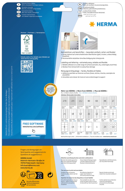 * Zelfklevende etiketten op A4-vellen, etiketformaat 17,8x10mm wit verwijderbaar, 25 vel per verpakking. Stevig hechtend op alle gladde, droge, onbeschadigde en stofvrije oppervlakken. Te verwijderen zonder resten achter te laten en zonder de ondergrond te beschadigen. Ideaal voor het tijdelijk of wisselend labelen en voor oppervlakken die niet mogen worden beschadigd. Zeer goede drukresultaten op alle laser- en inkjetprinters, kopieerapparaten, kleurenlaserprinters en kleurenkopieerapparaten. Storingvrije verwerking dankzij veiligheidsrand rondom en optimale vlakligging. Milieuvriendelijk: FSC® Mix Credit-gecertificeerd, chloorvrij gebleekt, oplosmiddelvrije contactlijm. Etiketten zijn 100 % recyclebaar via het oud papier, verpakking van gerecycled karton. Gratis softwareoplossingen: www.herma.com/software.