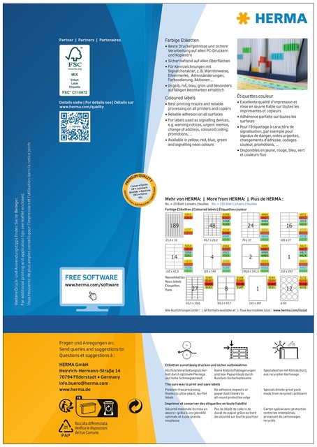Gekleurde etiketten op A4-vellen, zelfklevend, etiketformaat 70x37mm blauw permanent hechtend, 100 vel per verpakking. Ideaal voor het labelen met signaalfunctie, bijv. waarschuwingsstickers, spoedaantekeningen, adreswijzigingen, kleurcodering, acties. Milieuvriendelijk: FSC® Mix Credit-gecertificeerd, chloorvrij gebleekt, oplosmiddelvrije contactlijm. Etiketten zijn 100 % recyclebaar via het oud papier, verpakking van gerecycled karton. Zeer goede drukresultaten op alle laser- en inkjetprinters, kopieerapparaten, kleurenlaserprinters en kleurenkopieerapparaten. Storingvrije verwerking dankzij veiligheidsrand rondom en optimale vlakligging. Gratis softwareoplossingen: www.herma.com/software.