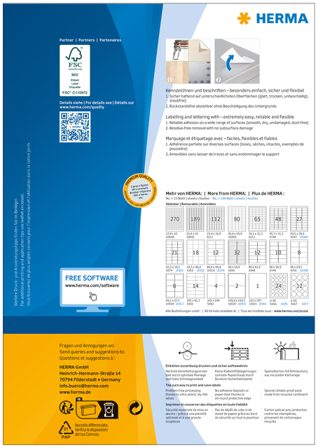 * Ronde, ovale en vierkante zelfklevende etiketten op A4-vellen. * Met Movables®-Technology: * Goed hechtend op alle gladde, droge, onbeschadigde en stofvrije oppervlakken, zonder achterblijvende resten weer te verwijderen zonder de ondergrond te beschadigen, kan probleemloos worden verwijderd en op een andere plek worden geplakt en meerdere keren worden gebruikt. * Ideaal voor flexibele labeling, voor het tijdelijk of wisselend labelen en voor oppervlakken die niet mogen worden beschadigd. * Zeer goede drukresultaten op alle laser- en inkjetprinters, kopieerapparaten, kleurenlaserprinters en kleurenkopieerapparaten. * Storingvrije verwerking dankzij veiligheidsrand rondom en optimale vlakligging. * Milieuvriendelijk: FSC Mix Credit-gecertificeerd. * Gratis softwareoplossingen: www.herma.com/software. 1 doos x 100 vel