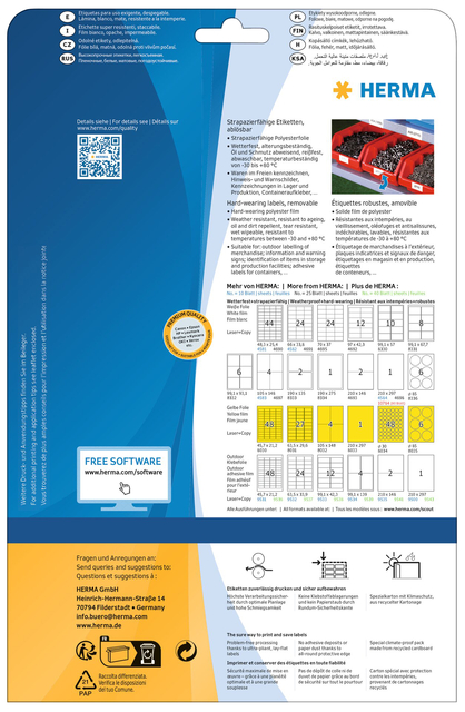 * Weervaste etiketten van witte, matte polyesterfolie. * Verwijderbaar op A4-vellen. * Zelfklevend. * Ideaal voor tijdelijke markeringen, etiketteren op zwaar belaste plaatsen en geschikt voor buitengebruik: eigendomsetiketten, etalage stickers, attentie- en waarschuwingsplaatjes, labelen in het magazijn en in de productie. * Bijzonder sterk hechtend en weer verwijderbaar zonder achterblijvende lijmresten. * Slijtvast oppervlak, weer- en verouderingsbestendig, olie en vuil afstotend, afwasbaar. * Temperatuurbestendig van -30 tot +80 °C. * Storingvrije verwerking dankzij veiligheidsrand rondom en optimale vlakligging . * Voor laserprinters en kopieerapparaten, kleurenlaserprinters en kleurenkopieerapparaten. * Niet geschikt voor inkjetprinters. * 20vel per verpakking. * Gratis softwareoplossingen: www.HERMA.nl/software. 1 doos x 20 vel