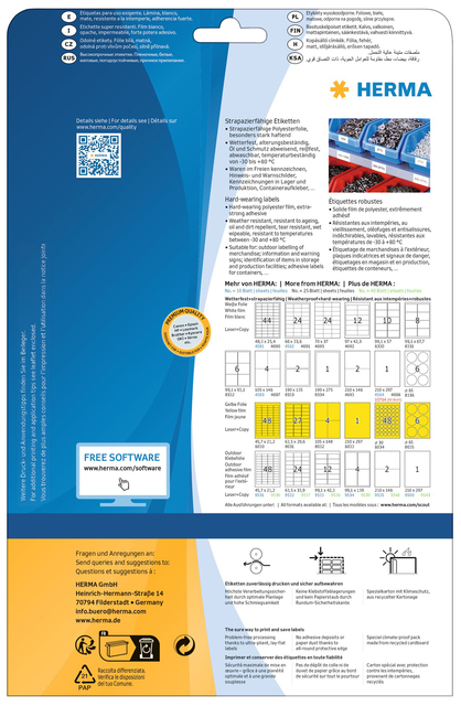 * Gele folie-etiketten op A4-vellen, zelfklevend. * Ideaal voor etiketten op zwaar belaste plaatsen en buiten: eigendomsetiketten, etalagestickers, attentie- en waarschuwingsplaatjes, labelen in het magazijn en in de productie. * Bijzonder opvallend dankzij de signaalkleur geel. * Slijt- en weervast oppervlak, zeer sterk hechtend, verouderingsbestendig, olie en vuil afstotend, afwasbaar. * Temperatuurbestendig van -30 tot +80°C. * Storingvrije verwerking dankzij veiligheidsrand rondom en optimale vlakligging. * Voor laserprinters en kopieerapparaten, kleurenlaserprinters en kleurenkopieerapparaten. * Niet geschikt voor inkjetprinters. * Gratis softwareoplossingen: www.herma.com/software. 1 doos x 25 vel