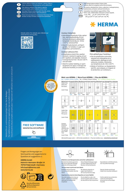 * Weervaste etiketten van witte, matte polyethyleenfolie, zelfklevend. * Ideaal voor outdoor-toepassingen en etiketten in zwaarbelaste omstandigheden: eigendomsetiketten, etalagestickers, attentie- en waarschuwingplaatjes. * Extreem sterk hechtend, ook op kritische oppervlakken. * Weervast, rekbaar, verouderingsbestendig, olie en vuil afstotend, afwasbaar. * Temperatuurbestendig van -40 tot +150°C,.* Voor laserprinters, kopieerapparaten, kleurenlaserprinters en kleurenkopieerapparaten. * Gratis softwareoplossingen: www.HERMA.de. 1 doos x 10 vel
