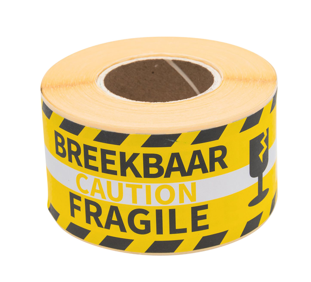 * Permanent klevend waarschuwingsetiket. * Gebruikt voor verzending en transport van goederen. * Formaat : 46x125mm. * Rol met 250 etiketten. * Tekst : breekbaar/fragile.