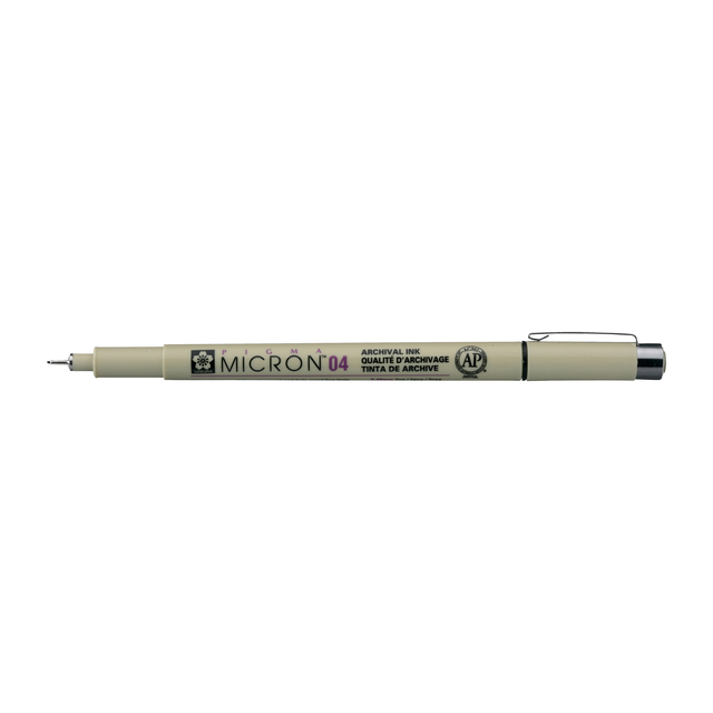 * Sakura Pigma Micron fineliner 04 met een puntdikte van 0.4 mm voor het tekenen van precieze lijnen. * De diepzwarte Pigma-inkt is lichtecht, archiveerbaar en wordt wereldwijd gewaardeerd door designers, archivarissen, manga-artiesten, cartoonisten en hobbyisten. * Unieke en ongeëvenaarde kwaliteit pigmentinkt. * Deze Pigma Micron fineliner is uitermate geschikt voor technisch en artistiek illustreren en tekenen, maar ook als archiveerpen. * De Pigma Micron fineliners zijn op nagenoeg ieder poreus oppervlak te gebruiken en uitstekend te gebruiken op kalkeerpapier. * Schrijfkleur: zwart. * Schrijfbreedte: 0,40mm.