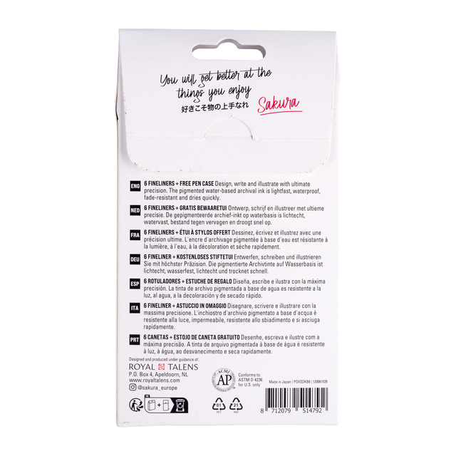 * De favoriete fineliners van ontwerpers, Pigma Microns, zijn nu verkrijgbaar in een speciale Black Edition. Mis deze stijlvolle, volledig zwarte versie van de iconische pen met de betrouwbare zwarte Pigma-inkt niet! * Pigma Micron-pennen zijn watervaste, permanente fineliners die trouw worden gebruikt door designers, wetenschappers, archivarissen, mangatekenaars, cartoonisten, illustratoren en hobbyisten. Het is de aanbevolen pen voor Zentangle. De fijne punt maakt deze pen ideaal voor zowel technische als artistieke tekeningen. PIGMA Micron is verkrijgbaar in tien verschillende puntdiktes en diverse kleuren voor precieze lijntjes met archiefwaardige inkt. * Deze set bevat 6 Pigma Micron fineliners in de populairste maten: 1 x 005 (0.2 mm), 1 x 01 (0.25 mm), 1 x 02 (0.30 mm), 1 x 03 (0.35 mm), 1 x 05 (0.45 mm), 1 x 08 (0.50 mm) en een gratis vilten etui. * De etui is stevig en duurzaam ontwikkeld, gemaakt van gerecycled polyester. Voorzien van een donkergrijze melange textuur, een drukknoop en een chick Sakura-label. De perfecte aanvulling op de dagelijkse benodigdheden van elke illustrator. Deze handige etui is makkelijk in gebruik en klein genoeg om in een jaszak of tas mee te nemen; een geweldig accessoire voor kunstenaars die veel onderweg zijn.