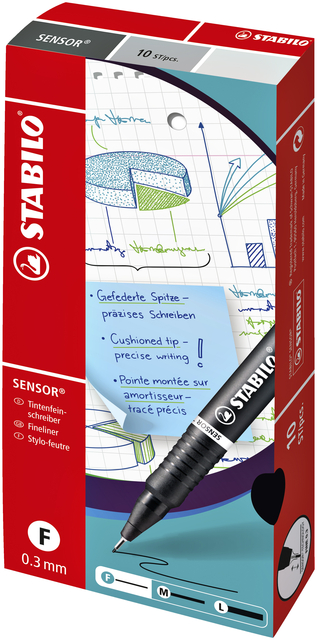 * Unieke fineliner met sensor technologie. * De op een microvering gemonteerde schrijfpunt zorgt voor een soepele schrijfstijl. * Inkt op waterbasis. * Schrijfbreedte fijn 0,3mm. 1 stuk