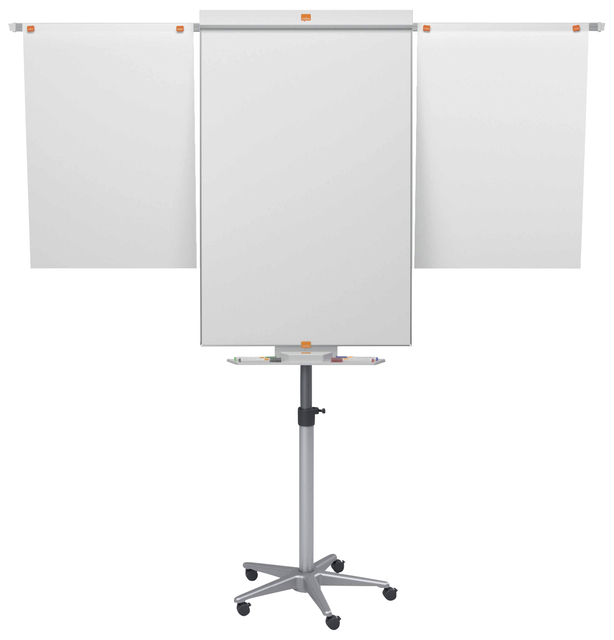 * De mobiele, magnetisch stalen flipover heeft een modern, onopvallend en smal frame waardoor de ruimte van het bord wordt gemaximaliseerd, met de ruime pennengoot geplaatst onder het bord zonder de schrijfruimte te blokkeren. In hoogte verstelbare mobiele voet met vergrendelbare zwenkwielen om te verplaatsen en vast te zetten. Uitklapbare magnetische armen bovenaan de flipover, die gemakkelijk kunnen worden uitgeschoven om extra pagina's te tonen. * Magnetisch whiteboardoppervlak van staal biedt een verhoogde uitwisbaarheid. * In hoogte verstelbare mobiele voet met vergrendelbare zwenkwielen. Uitklapbare magnetische armen bovenaan de flipover, die gemakkelijk kunnen worden uitgeschoven om extra pagina's te laten zien. * Haken zijn meegeleverd om de flipoverblokken op te hangen waardoor het verwijderen van pagina's vereenvoudigd wordt. * Geleverd met een Nobo droog-uitwisbare marker. * 15 jaar garantie op het stalen whiteboardoppervlak. * In drie hoogten verstelbaar: 175cm/ 182cm/ 190cm. * Voet voorzien van 5 vergrendelbare wielen. * Bordoppervlak van 100x70cm. 1 stuk