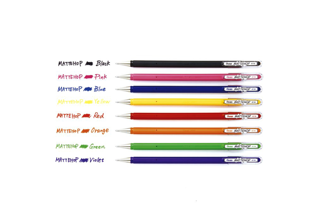 * De Pentel Mattehop is een innovatieve nieuwe gelroller. * Na het drogen heeft de inkt een matte afwerking. * Heldere inkt schrijft niet alleen goed op wit papier maar ook op gekleurd- en fotopapier. * Voor schrijven, technische tekeningen, illustraties, schetsen, ontwerp en document-/archiefgebruik. * Verkrijgbaar in 8 levendige kleuren. * Schrijfbreedte 0.5mm - kogelbreedte van 1.0mm. * Dit product bestaat voor 55% uit gerecycled materiaal. 12 stuks