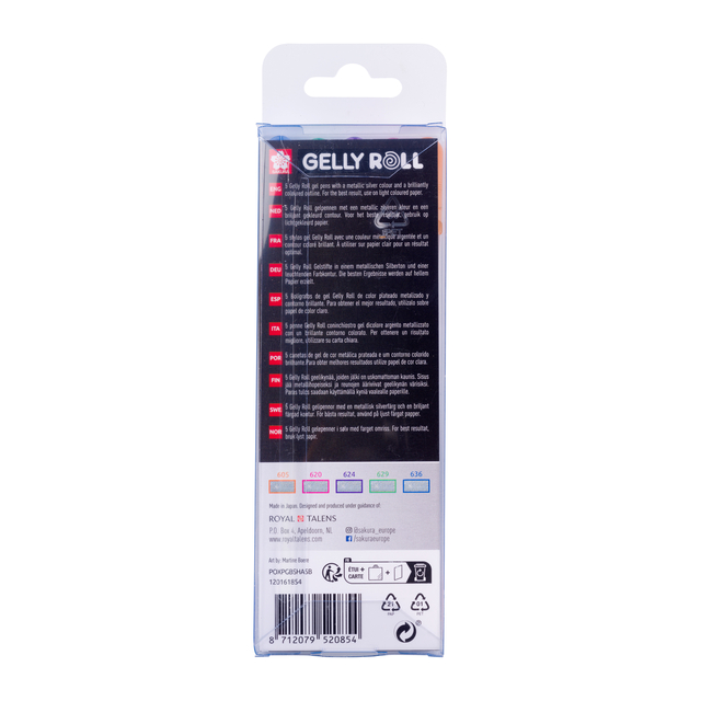 * Voeg een beetje magie toe aan je schrijfwerk! * Met de elegante glinsterende gel-inkt van Gelly Roll Gold Shadow kun je schrijven in metallic goud met een levendig gekleurde rand. *Deze pennen bieden hetzelfde soepele schrijfcomfort van de andere Gelly Roll pennen, maar met een uniek effect! Perfect voor uitnodigingen, handgemaakte kaarten, lettering en tekeningen. * Laat de kleur nog meer opvallen door de metallic laag voorzichtig uit te gummen. Gebruik op wit, poreus papier voor het beste resultaat. * Lijndikte: 0,7 mm. * Ook verkrijgbaar in gouden kleuren! * Deze set bevat alle 5 Gelly Roll Silver Shadow kleuren.