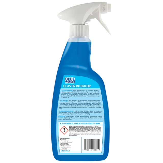 * Blue Wonder Glas en Interieur Professioneel verwijdert veilig en snel vet, vuil en glas en glanzende oppervlakken. Droogt streeploos op, dus nadrogen is niet nodig. * Gebruiksklaar product. Blue Wonder Glas en Interieur Professioneel is geschikt voor glas, kunststof, hout, metaal, melamine, spiegels en hoogglanzende oppervlakken. * Gevarenaanduidingen: H225, cat. 2: Licht ontvlambare vloeistof en damp. H302, cat. 4: Schadelijk bij inslikken. H312, cat. 4: Schadelijk bij contact met de huid. H315, cat. 2: Veroorzaakt huidirritatie. H319, cat. 2A: Veroorzaakt ernstige oogirritatie. H332, cat. 4: Schadelijk bij inademing. H336, cat. 3: Kan slaperigheid of duizeligheid veroorzaken. * Veiligheidsaanbevelingen: P101: Bij het inwinnen van medisch advies, de verpakking of het etiket ter beschikking houden. P102: Buiten het bereik van kinderen houden. P103: Alvorens te gebruiken, het etiket lezen. P264: Na het werken met dit product ... grondig wassen. P305+P351+P338: BIJ CONTACT MET DE OGEN: voorzichtig afspoelen met water gedurende een aantal minuten; contactlenzen verwijderen, indien mogelijk; blijven spoelen. P337+P313: Bij aanhoudende oogirritatie: een arts raadplegen.