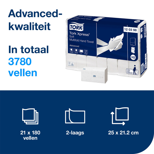 * Creëer een aangename sanitaire ruimte voor uw gasten met deze witte papieren handdoeken. Gasten kunnen hun handen snel en comfortabel afdrogen dankzij de zachtheid en het hoge absorptievermogen van de handdoeken. Bovendien hebben deze handdoeken een voordelig kleiner formaat. Ze zijn geschikt voor de gezondheidszorg en voor industriële en educatieve omgevingen. Optimaliseer de hygiëne en beperk verspilling door een Tork Xpress® dispenser met vel-voor-vel-dosering te plaatsen, zodat gebruikers alleen aanraken en uitnemen wat ze nodig hebben * Geschikt voor alle Tork H2 dispensers * Aantrekkelijke Tork leaf-opdruk* Vel-voor-vel-dosering voor minder verbruik en betere hygiëne * Tork Easy Handling-draagverpakking voor optimal interne transport * Ideaal voor sanitaire ruimten met gemiddelde bezoekersaantallen * FSC-keurmerk en EU Ecolabel voor een lagere milieu-impact * 100% gerecyclede vezels * Geschikt voor kort contact met voedingsmiddelen * Afmeting bundel 130x85x212mm, afmeting handdoek 255x212mm.