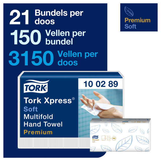 *De Tork Xpress® multifold papieren doekjes zijn de ideale oplossing als het toilet hygiënisch en representatief moet zijn. * Het zachte witte premium handdoekpapier maakt indruk dankzij de hoogwaaridge uitstraling en het aantrekkelijke reliëf. * Extreem absorberend en scheurbestendig, zuinig in gebruik. * Ideaal voor toiletruimtes met een laag tot gemiddeld bezoekersaantal. * Tork Xpress® multifold papierendoekjes is FSC gecertificeerd en met het EU Ecolabel wordt er gegarandeerd dat er een lager effect is op het milieu dan vergelijkbare producten. * Tevens is Tork Xpress® multifold papieren doekjes ISEGA-gecertificeerd, dat wil zeggen dat het papier geschikt is voor kortstondig contact met voedsel. * Deze gevouwen doekjes zijn geschikt voor de Tork H2 Xpress® multifold dispenser. * Verpakking 21 bundels x 150 vel. * Afmeting bij gevouwen (b x l): 212x85mm. * Afmeting bij ongevouwen (b x l): 212x255mm. 1 doos x 21 pak