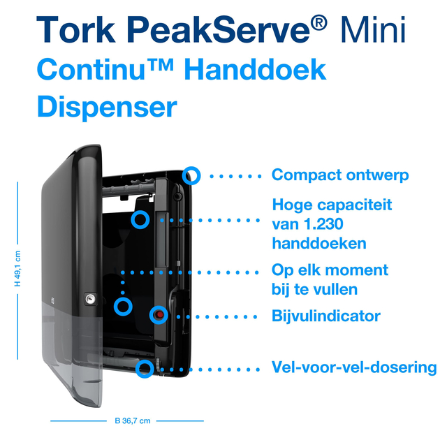 * Tork PeakServe® Mini Continu™ Papieren HanddoekDispenser de nieuwste innovatie voor drukbezochte toiletruimtes, waar de doorstroom van de gasten essentieel is. * Deze slanke handdoekdispenser heeft hoge capaciteit van 1230 handdoeken wat de vultijd halveert. *Dankzij het Continu™ handdoekensysteem worden handdoeken in slechts 3 seconden uitgegeven en zijn storingen verleden tijd. *Gebruik voor het vullen de 50% gecompimeerde vullingen, deze kunnen snel op ieder worden gevuld, zijn eenvoudig op te slaan en te vervoeren. * De hoogglanzende behuizing van hoogwaardig kunststof is beschikbaar in het wit of zwart. * Deze compacte dispenser voor handdoeken is ideaal voor in kleine ruimtes. * Afmeting 491 x 101 x 367mm.