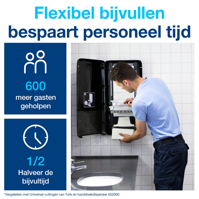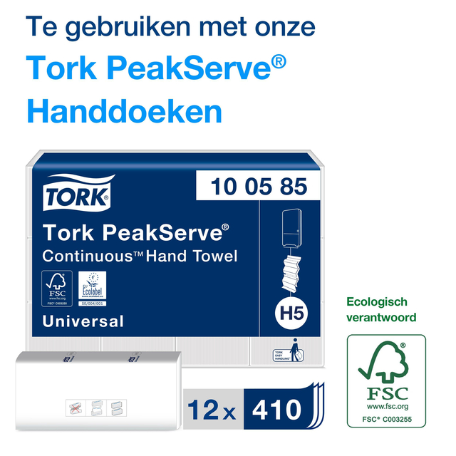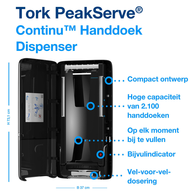 * Tork PeakServe® Continu™ Papieren HanddoekDispenser de nieuwste innovatie voor drukbezochte toiletruimtes, waar de doorstroom van de gasten essentieel is. * Deze slanke handdoekdispenser heeft tot 250% hogere capaciteit dan de reguliere Tork handdoekdispensers. *Middels de Easy to use systeem kan het snel en op elk moment worden bijgevuld en verbeter je bezoekersflow met het gepatenteerde Continu™ systeem dat Tork handdoeken uitgeeft in slechts 3 seconden. *Gebruik voor het vullen de gecompimeerde vullingen, deze kunnen snel op ieder worden gevuld, zijn eenvoudig op te slaan en te vervoeren. Deze dispenser wordt gebruikt met Tork EasyCube™ facilitymanagementsoftware. * De hoogglanzende behuizing van hoogwaardig kunststof is beschikbaar in het wit of zwart. * Afmeting 731 x 101 x 370mm.
