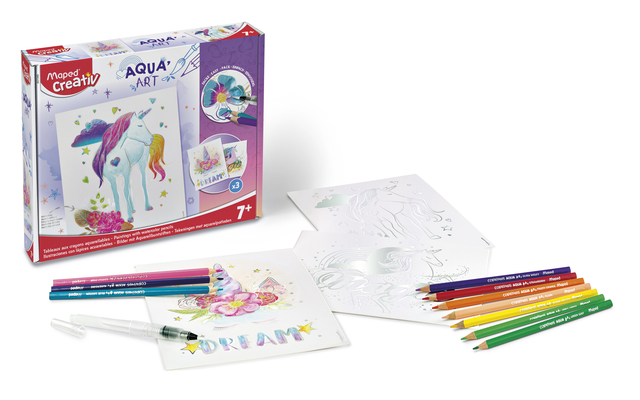 * Maak kennis met onze Maped Creativ Aqua Art Set, de perfecte manier om een vleugje creativiteit, kleur en design aan je wereld toe te voegen. * Deze set bevat 3 mooie prints met het formaat 21x17,3cm, 1 speciale waterbrushpenseel en 10 aquarelleerpotloden. * Het thema van deze set is "Eenhoorn".