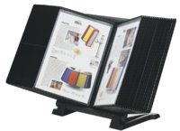 * Handig kunststof informatiesysteem in zwart voor op het bureau of aan de wand. * De gebruiker bepaalt zelf de optimale leesstand. * De basisset heeft 10 A4-infotassen voor 20 A4-tjes. * Zeer stabiele standaard door de verzwaarde metalen onderzijde. 1 stuk