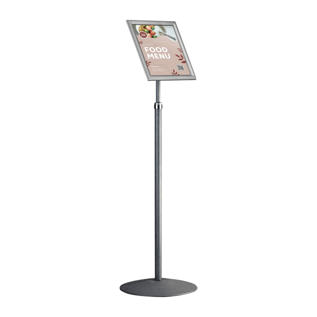 * Telescopische informatiestandaard. * Inclusief A4 formaat verstekhoek kliklijst met Easy-Click systeem voor een snelle, eenvoudige en representatieve presentatie. * Kliklijst van geanodiseerd aluminium met kunststof achterzijde. * De helder transparant ontspiegeld voorzetfolie beschermd de poster tegen vuil en vocht. * Standaard is eenvoudig te monteren. * De kliklijst kan zowel staand als liggend worden geplaatst. * Voetstuk Ø360mm met stalen bodemplaat. * Staander in verschillende hoogtes instelbaar tussen 1000-1400mm.