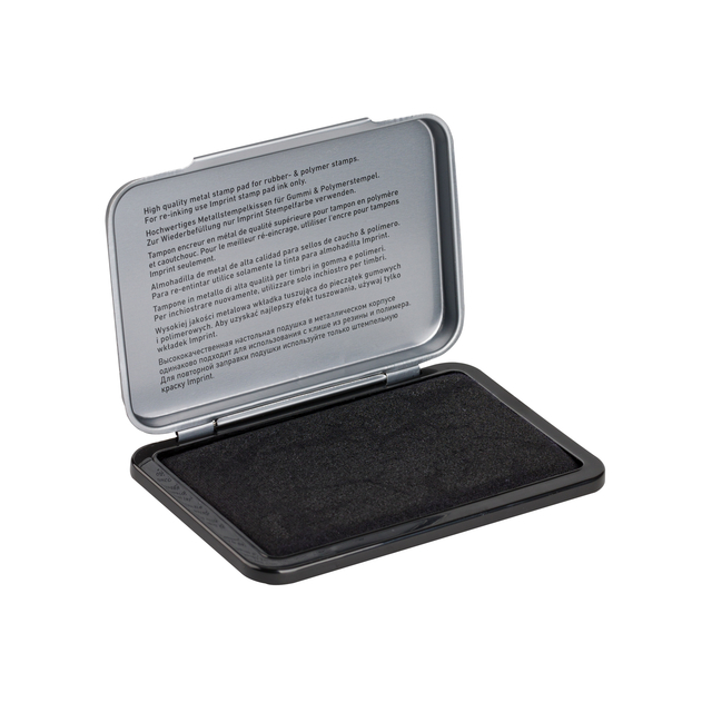 * 9071M Metalen handstempelkussen met zwarte inkt, afmeting 90 x 50mm. * Watergebaseerde inkt zonder olie (voor rubber- en polymeerstempels) en is voldoende voor duizenden schone en kleurintensieve afdrukken.