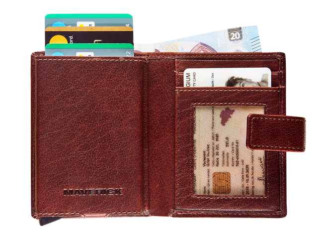 * MAVERICK ROUGH GEAR lederen CardProtector super compact anti-skimbeschermt je creditcards tegen elektronische diefstal. * De lederen etuis hebben een RFID protected aluminium case. * Met hendelmechanisme om je kaarten omhoog te duwen. * De ROUGH GEAR-collectie heeft een unieke look. * Plantaardig gelooid volnerf buffelleder. * Sterk en robuust, met een stoere nerf en handgestikte naad in contrastkleur, voor een duotoon kleureffect. * Plaats voor 7 kaarten zonder reliëf of 5 kaarten met reliëf. * Ruimte voor bankbiljetten. * Extra ruimte voor ID-kaart. * Vak met rits achteraan. * www.maverickleather.com.