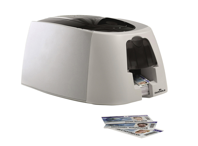 * Printer om snel passen of kaarten af te drukken. * Inclusief kleurenprintlint en 100 blanco kaarten. * De afdruk is waterproof en is mogelijk van rand tot rand. * Naar keuze af te drukken in kleur, met het bijgeleverde printlint, of in zwart, met een apart aan te kopen monochroom printlint. * De printer is voorzien van een gemakkelijk na te vullen kaartlade voor 25 standaardkaarten (of 40 dunne kaarten). * Software voor het bedrukken van de kaarten is gratis beschikbaar op www.duraprint.eu. * De gedrukte kaarten zijn ideaal om te gebruiken in de veiligheidspashouders van DURABLE.