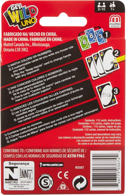Het meest gespeelde gezinskaartspel! Probeer als eerste al je kaarten kwijt te raken! Gebruik Actiekaarten tegen je tegenspelers! En vergeet niet "UNO!" te roepen als je nog maar één kaart heb. Er zijn 4 verschillende kleuren kaarten, rood, groen, blauw en geel, met de nummers 0 tot en met 9 daar op. Je kan alleen je kaart opgooien als de kleur of het cijfer op de kaart het zelfde is. Er zijn ook een aantal zwarte kaarten daarmee kun je andere spelers dwars zitten.