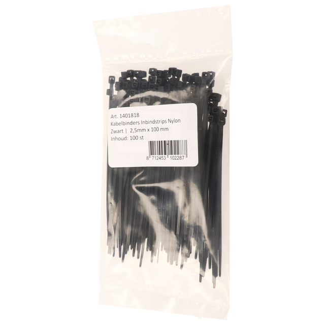 * Zwarte kabelbinders. * Kabelbinders worden gebruikt voor het samenbinden van kabels of andere materialen. * Eenmalig te gebruiken. *UV-bestendig waardoor lange levensduur, word niet poreus. *100stuk per pak. * Lengte 100mm, breedte 2.5mm. * Maximale diameter toepassing 20mm. *Max. toelaatbaar gewicht 8 kg.