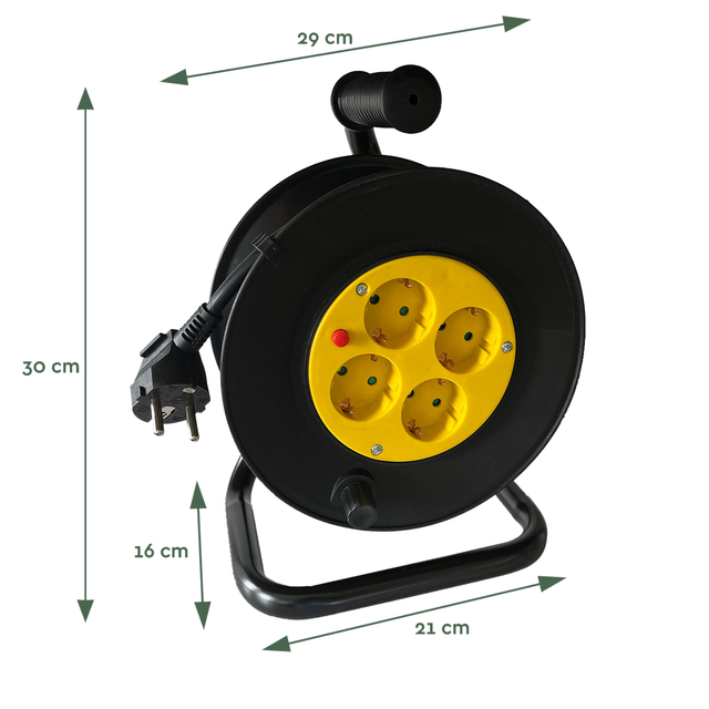 * Nooit meer een stopcontact te kort! * Onze kabelhaspels zijn ontworpen met het oog op gemak. Deze kabelhaspel heeft een praktische stekkerdoos, en met 4 geaarde contactdozen sluit je eenvoudig 4 kabels aan. Ze zijn eenvoudig op te rollen en uit te trekken, waardoor je kostbare tijd bespaart. De kabelhaspel, gemaakt van kunststof, heeft een praktische stekkerdoos. En voor een perfecte kabelcontrole bij het op- en afrollen heeft hij een roestvrij gegalvaniseerd draagbaar frame.* De BRASQ Kabelhaspel heeft een kabel van 10 meter, waardoor je een groot bereik hebt. En met het ergonomische handvat is oprollen een fluitje van een cent. De haspel beschikt over een thermische beveiliging, die de haspel uitschakelt bij te hoge temperatuur. * De BRASQ Kabelhaspel worden vervaardigd met hoogwaardige materialen die bestand zijn tegen slijtage en zorgen voor een veilige omgeving. * Afmetingen contactdoos: 29 x 30 cm (lxh) incl handvat * Capaciteit: 4 stekkers * Materiaal: Kunststof * Kabellengte: 10 meter * Voeding: Netstroom * Hoofdstekker: Randaarde * Stopcontact: Schuko Type F (randaarde) * Aansluiting: 3-polig * Max. Belasting opgerold: 1100W Max. Belasting uitgerold: 3200W * Nominale stroom: 230V * Max. Ampere opgerold: 4,78A, Max. Ampere uitgerold: 13,91A * draaddikte: 3 x 1,5mm * Oververhittingsbeveiliging: Ja * Keurmerken: ROHS, GS en CE certificaat * Garantie: 1 jaar