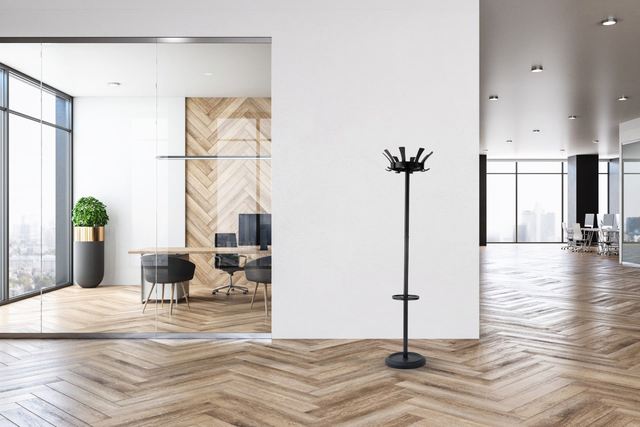 * De Kapstok Londen van BRASQ zou je een kroon op je werk kunnen noemen. * Deze staande kapstok beschikt over 6 stevige haken en biedt in zijn totaliteit plaats voor 12 jassen. * Als het weer een beetje tegen zit kan je ook je paraplu kwijt in de daarvoor geschikte houder. * Deze luxe kapstok is volledig in het zwart uitgevoerd en is uitermate geschikt voor alle werkruimten. * De Londen kapstok is gemaakt van hoogwaardig staal en is daarnaast afgewerkt met een zwarte poedercoating. * Door de poedercoating is de kapstok kraswerend en gaat de kapstok extra lang mee zonder te verkleuren. * Alle BRASQ kapstokken beschikken over een verzwaarde voet met een kunststof behuizing wat zorgt voor een solide staande kapstok. * De BRASQ kapstok Londen wordt als een bouwpakket geleverd. In slechts een paar eenvoudige stappen staat deze kapstok in elkaar. * De handleiding wordt uiteraard meegeleverd. * Diameter voet: 35cm. * Diameter stalen buis: 48mm.